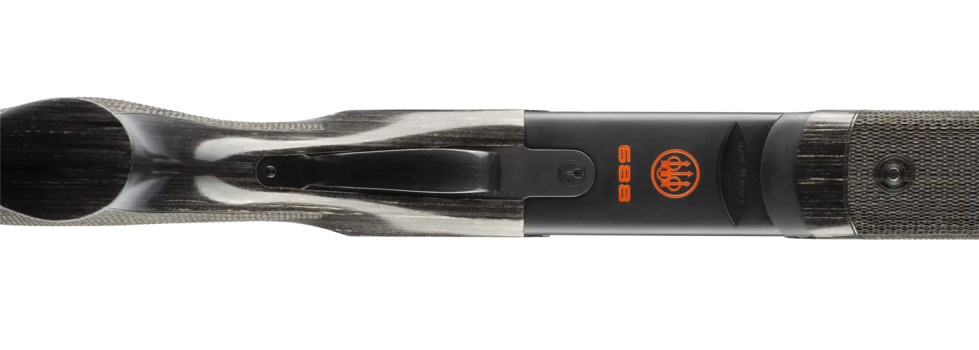 The black laminated wood stock, with its sleek glossy finish, not only gives the 688 Performance a modern aesthetic, but also maintains consistent weight and offers superior weather resistance compared to traditional walnut. The blued steel receiver with distinctive orange 688 logo and laser-engraved anti-glare finish completes the modern style of the gun.