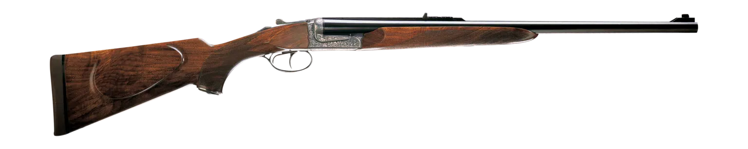Action with solid sidebars for strength, double-scalloped for a firm wood-to- metal fit. Double trigger “Blitz”-type battery. New deep-cut Royal style engraving motif, with a “al bulino” cape buffalo trophy on action bottom. Double parallel locking underlugs. Barrel length 600 mm (24 in.) or 650 mm (26 in.) depending on chambering. Quarter-rib with express-style rear sight with one fixed blade and three folding blades, prepared for scope bases installation. AAA Fancy walnut pistol grip stock with an english-style cheekpiece and an old english buttpad, hand-rubbed oil finish. Extended trigger plate with bordered, engraved trigger bow, reservoir engraved steel pistol grip cap. Comes in a moulded plastic case.