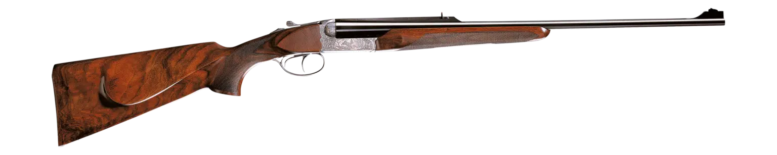 A classic from Chapuis, the UGEX rifle is a superb piece of workmanship. The scalloped and sculptured all-steel action is engraved with chisel-chased floral borders complemented by images of a roebuck to one side, a wild boar on the other and a red stag underneath the action. Hand selected, AAA fancy grade walnut pistol grip stock with English-style cheekpiece on ejector guns (AA fancy grade on extractor versions) with matching checkered walnut buttplate and forend.
