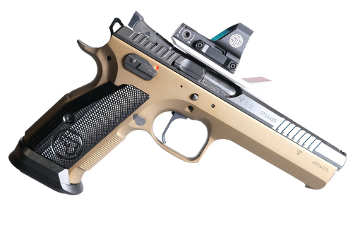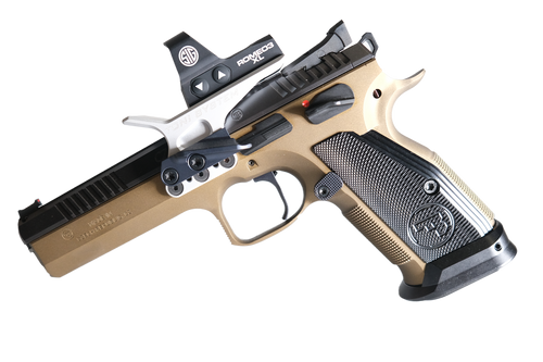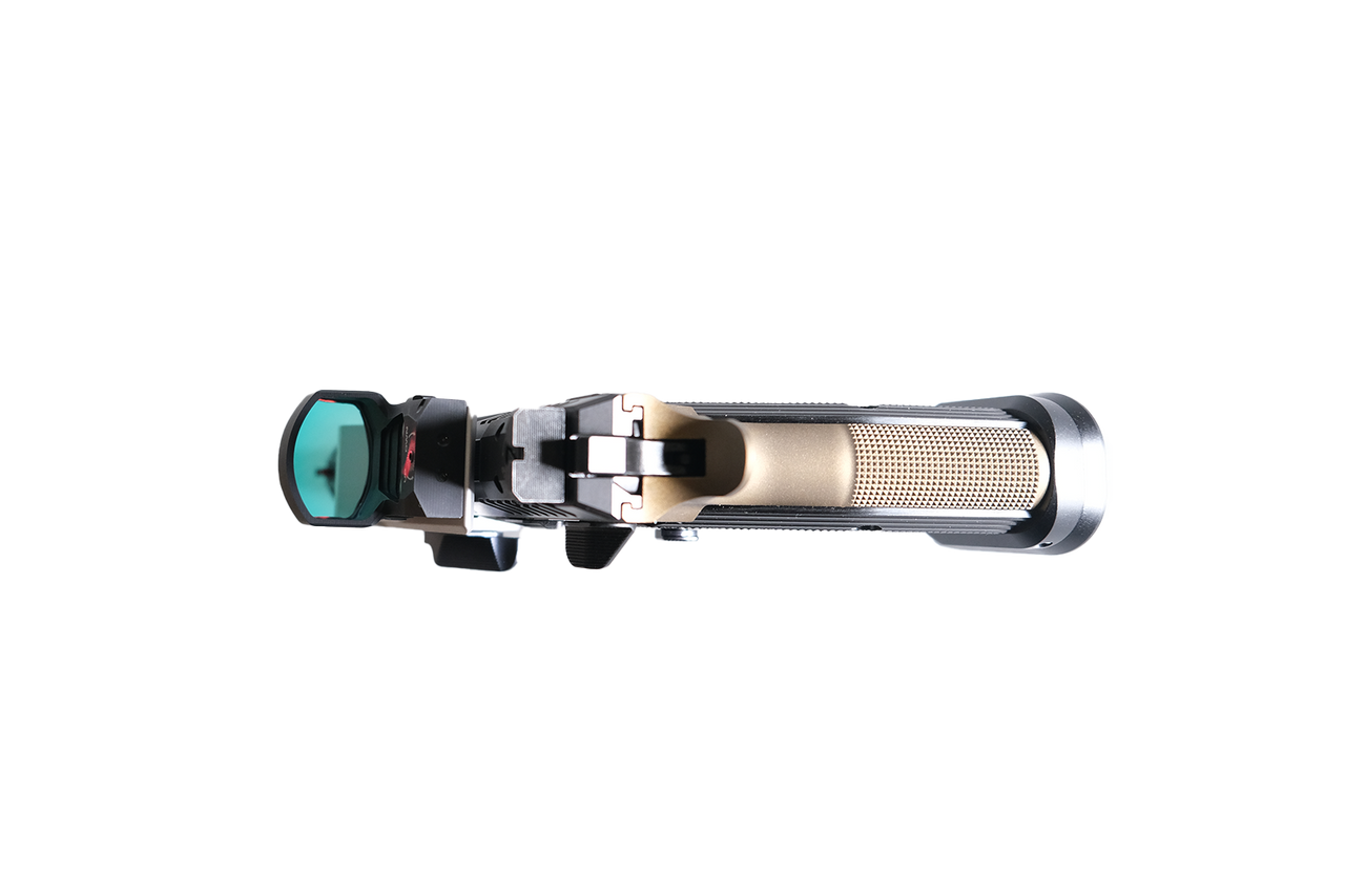 A masterpiece of the sports special for competing in the IPSC Standard Division. This hand-fitted and matched model features a frame with a Bronze Cerakote finish and a polished barrel. Its flat duralumin grips and magazine base are black anodized. The pistol comes standard with a pin instead of a slide stop and is equipped with an adjustable metal sight, adjustable left thumb rest, adjustable, black anodized magazine release and an extended manual lock safety on the left side (flat on the right side).